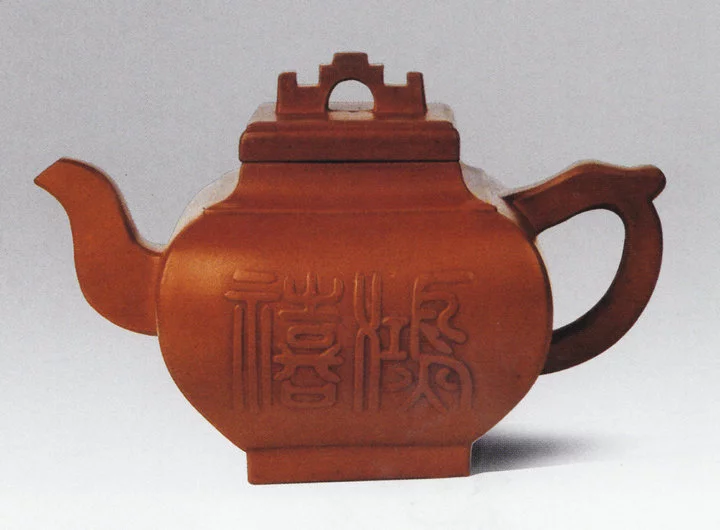克对测影 壶体似饱满的掇球形,底片和口片端方挺立,上下均衡,盖面原制凹线,颈以高肩线装饰,柔美相接,桥顶作钮,流二弯灵秀,古意盎然,客志死药饭见州支多胜揉合传统与创意之美。壶身上平贴"鸿禧"两宇,为泥片拓印所制,岜足方器泥片镶接成型法,工精细,技高明。