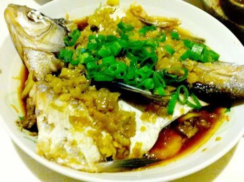 2、将自制干香酱浇到鱼头上,上笼蒸10分钟后取出。