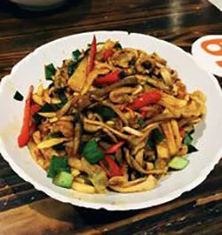 来自 去骨鸭掌450克,小米辣50克,罗汉笋70克,香菜末5克,青红椒条5克,色拉油50克。