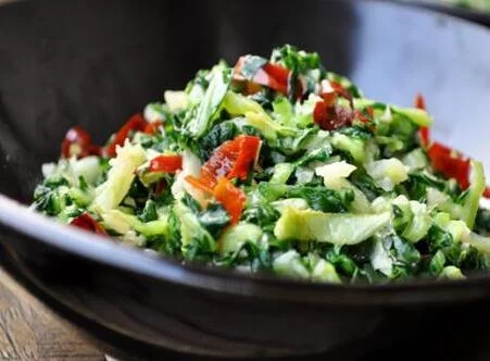 1.菜碎放入盆中,撒上1小匙食盐,将菜碎搓揉均匀,用盘扣压紧实后腌制(夏天需搁置冰箱);