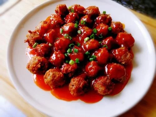4真析行织正的司优家定洲.重新起锅烧热,下一点点油,下入丸子翻炒,再下生抽、醋、糖炒匀上色收汁即可 。