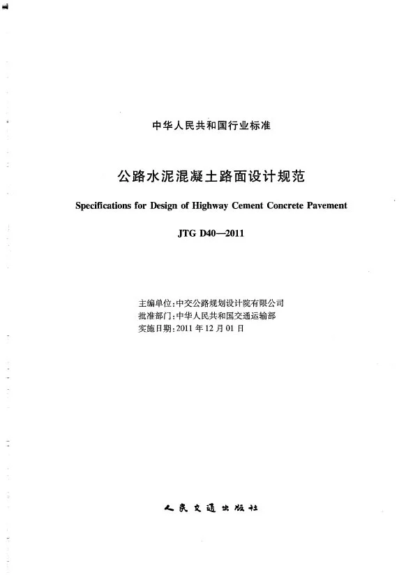 目前最新的《公路水泥混凝土路面设计规范》版本为JTG D40-2011,自2011年12月01日起实施,原《公路水泥混凝土路面设计规范》JTG D40-2002版本同时废除。
