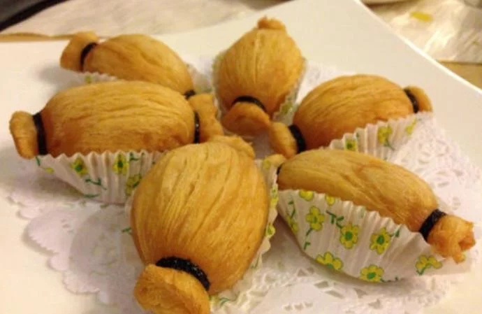 制法:1、白糖加入清水溶解,糯米粉与吉士粉混合,之后加入猪油、熟红薯蓉混合均匀后,角去强示出体每个30克。2、包入15克的木瓜馅做成瓜形,尾部插入西芹茎,用150度油温的花生油小火炸至色泽金黄、表皮松脆即可。