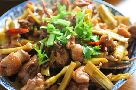 春笋烧鸡是时令菜肴,每到春笋出来时,此菜就深受食客欢迎。是一道原汁原味的家常菜。