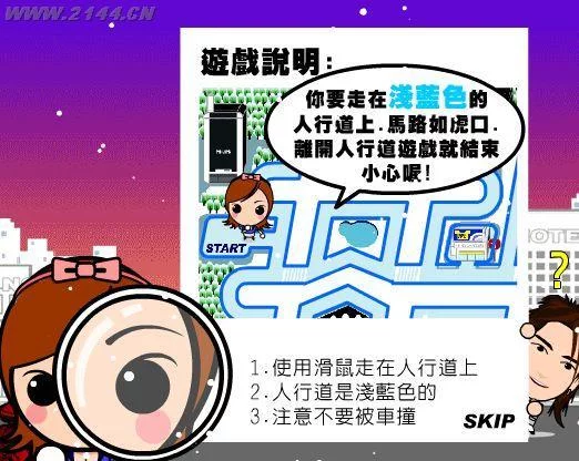 鼠标滑动:标控制女孩移动(记住不能移动到蓝色的人行道以外哦!不然会被警察抓住的)。