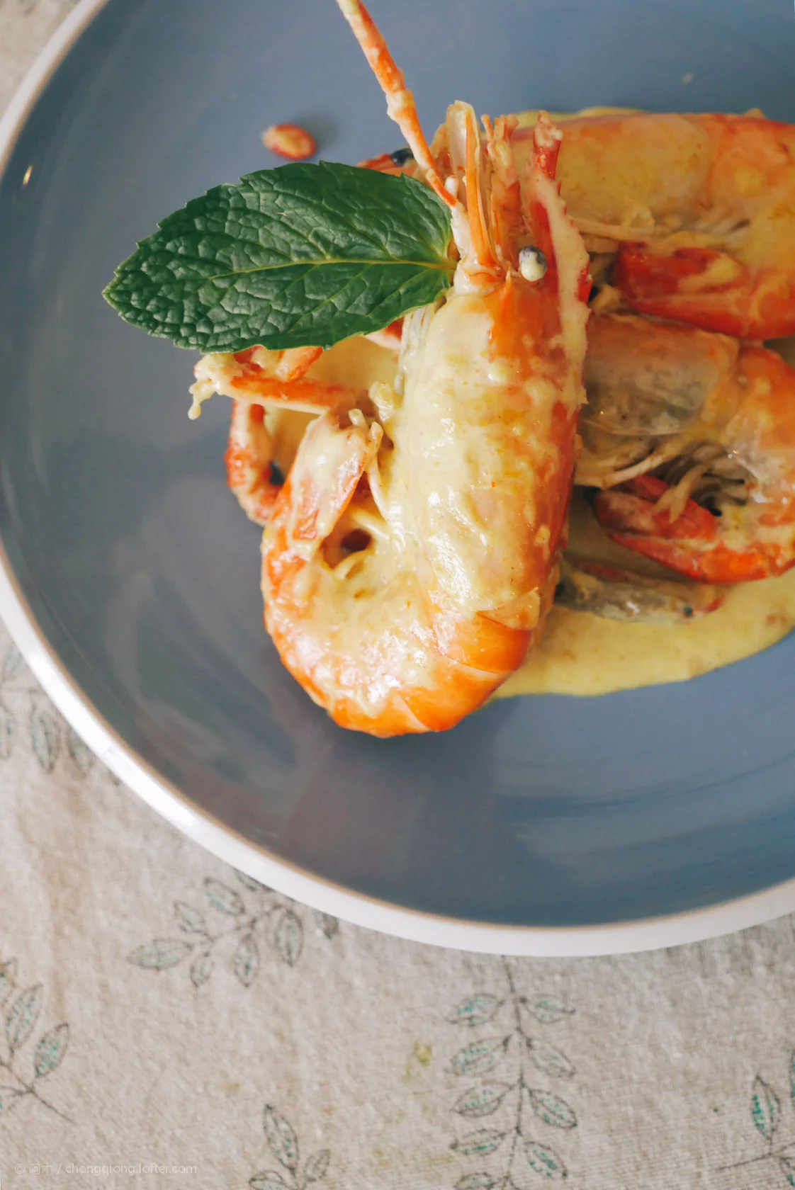 1.材料:中虾 - 300G ,鸡蛋 - 1 粒, 黄油,淡奶,咖喱香叶 - 适量