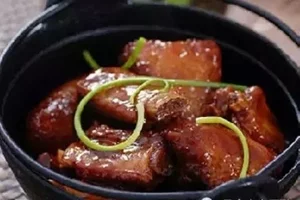 2;将猪油放入锅内,热后投入锅内,热后投入葱段、姜片炝锅,再加入酱油、料酒、清水(2公斤)、精盐,开锅后放入烫过的排骨,再开时转微火煨约1小时,再转大火,调如味精即成。
