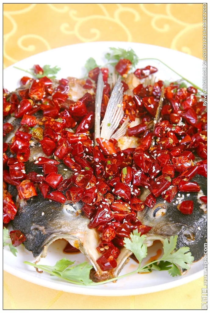 另取净炒锅,大火烧热2茶匙(10ml)油,煸香拌好的辣椒雪梨等调料。然后放入鱼头块同炒,约3分钟后,当所有材料世查章少毛均匀入味时即可。