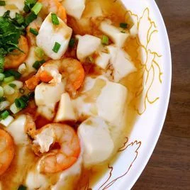 原料:豆腐150克,大虾干30克,猪肉胶100克,小油菜50克。