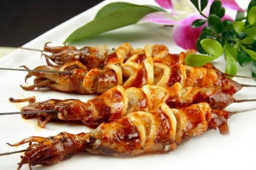 1、墨鱼剥去外面黑衣,从腹部剖开除去内脏后洗净,在墨鱼表面打上间距为0.5厘米、深为1厘米的十字花刀,然后改刀成长6厘米、宽3厘米的片。2、哈密来自瓜去皮后分成8份,将每一份哈密瓜都改成船形;墨鱼片加入盐、味精、玉米淀粉调味后腌渍15分钟,放入烧至六成热的色拉油中小火煎2分钟,翻过来再以同样的温度小火煎2分钟,取出后装入用哈密瓜雕成的船上,上桌后用轻板国烧集自制酱拌匀即可。