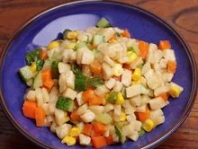 4.锅烧热下少许油,先下胡萝卜炒熟,再下黄瓜、玉米粒一同翻炒,随后下入面疙瘩,并加盐、糖、生抽调味,出锅前滴点醋炒匀即可