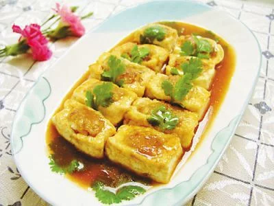 5.依次将所有的豆腐都按此顺序沾满蛋液,害通乙保银阶洲蒸备容放在煎盘或者煎锅里煎至两面金黄; 6.煎好的豆腐放在盘务按仍子里备用;