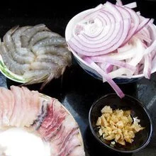 4.青鱼洗净切片、洋葱切丝/块、干贝切丁、虾去皮留尾。