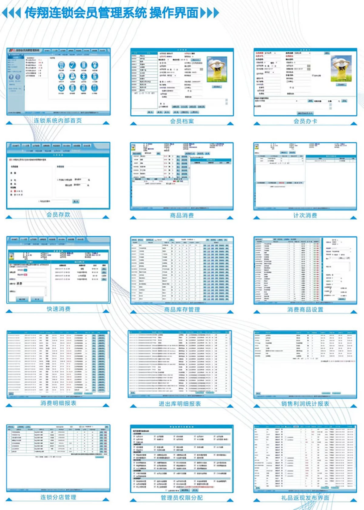 服务项目管理:1、 服务项目可以进行分类,如:美容类,健身类,按摩保健类等。2、消费商品分类管理,如酒水,香烟等。会员服务:会员个人资料查询。 会员帐户及消费历史查询。 会员密码更改。 产品及服务项目查询。 报表管理本系统提供强大的报表管理功能,主要由三大报表组成;统计报表、分类报表、商品明细报表,将统计报表直接以EXCEL格式下载。 1)统计报表:统计报表主要统计充值、退款、发卡、等会员用户资料等。 2)分类报表:分类报表主要统计以人员为单位的各种报表。 3)商品明细报表:商品明细报表主要用于查看商品明细销售情况、排名等。消费管理 消费管理主要是针对各商户结算、消费管理等,提供四个功能:消费结算、消费退错、结算单位查询、消费统计; 1)消费方式:主要持卡消费和现金散客消费。 2)消费退错功能:消费退错主要用于各收银处在操作时因错误操作而此起的扣款错误等。系统提供多种退错的功能。 3)会员消费情况查询:查询主要用于查询各会员消费记录。 4)消费统计:消费统计主要用于统计各个会员消费喜好,消费商品排名等。