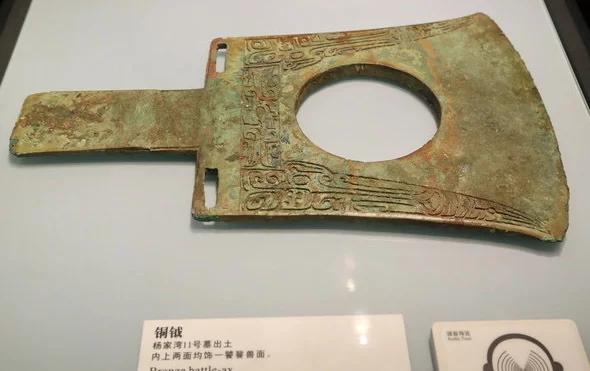 铜钺李家来自嘴肩及两侧各饰夔纹,两侧夔纹尾部为蝉纹。现藏于湖北省博物馆。 中文名称 铜钺李家嘴 出土地点 盘 龙城 馆藏地点 湖北省博物馆馆 所属年代 夏代晚期 湖北省博物馆馆藏文物。 钺 (yuè,音月)为砍杀 兵 器 ,亦可为刑具。青铜 钺 最早见于夏代晚期,沿用至战国时代。 盘 龙城出土之 钺 是权力象征。 点击展开全文 转载请注明出处安可林文章网 » 铜钺李家嘴