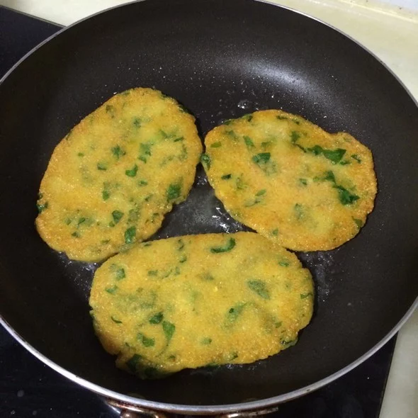 12.不粘锅或者电饼铛上刷少许油,小火加热。取适量的面糊揉圆后贴在锅中按瘪,约1cm厚,不要太厚,太厚不容易熟。带一面可以轻松晃动,出咯吱了再翻面贴另外一面即可。