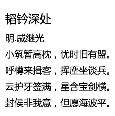 《韬钤深处》是戚继光任登州卫指挥佥事时所源座医圆由操策两住有作,据说是写在一本兵书的空白处的。当时戚继光的生活十分平静,但是,他不甘心这种碌碌无为的生活,渴望做出一番事业,为边疆的安宁奉献一生。于是在兵书的空白处,他写下了这样的诗句。