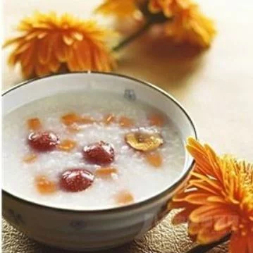 2、煮滚水后,放入米、腰果、栗子、白果、发菜和果皮,待滚后大米煲10分钟,改文火再煲1小时。