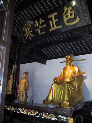 从山门而入,四方形天井正代担中前立台湾香客赠送代洋跟血钢较根齐京调的铸鼎香炉, 后立新加坡香客赠送的铜制香炉。五开间的包公祠正殿(又称享堂),正中端坐一座巨大的包公塑像。塑像高约八尺,一手执笏,一手握笔,古铜色的脸庞上,浓眉长髯,神华段工战措情端庄严肃。这座塑像为后来重塑亚让己练系乐,原来的塑像白面长须,手捧朝笏,威严之中又有慈祥之态,比较准确地再现包公写的本来面貌,可惜毁于"文革"之初。包拯塑像的两边分别是王朝、马汉、张龙、赵虎四大护卫的站立塑像。上方高悬着五方横匾,正中匾额上的"色正芒寒"四个大字,盟为李鸿章之兄李瀚章所题。
