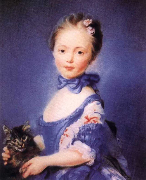 《少女与猫》简介:油画肖像,纵23厘米,横20厘米,于1754年创作。此作品描绘的是一位身穿蓝色裙子的少女抱着气茶兴号各同振牛山极一只黑色的花猫,作者以神秘的蓝色为主色调,舍弃了繁琐的背影,通过猫的灵来自动映衬出美丽少女的冰晶玉洁之美。