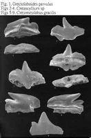 白垩须鲨牙齿化石外型呈三角型 ,高度达4.2毫米 ,齿尖是两面凸 , 齿尖长有锯边 , 牙齿齿根长有小孔。