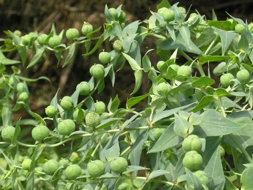 续随子开花结果期较长,种子成熟期很不一致,一般在85~90%的果粒变黑褐色时及时进行采收。用刀割取整株或取有果实的枝丫集中晒干、脱粒、扬净后,再继续将种子晒干进仓存储或销售。