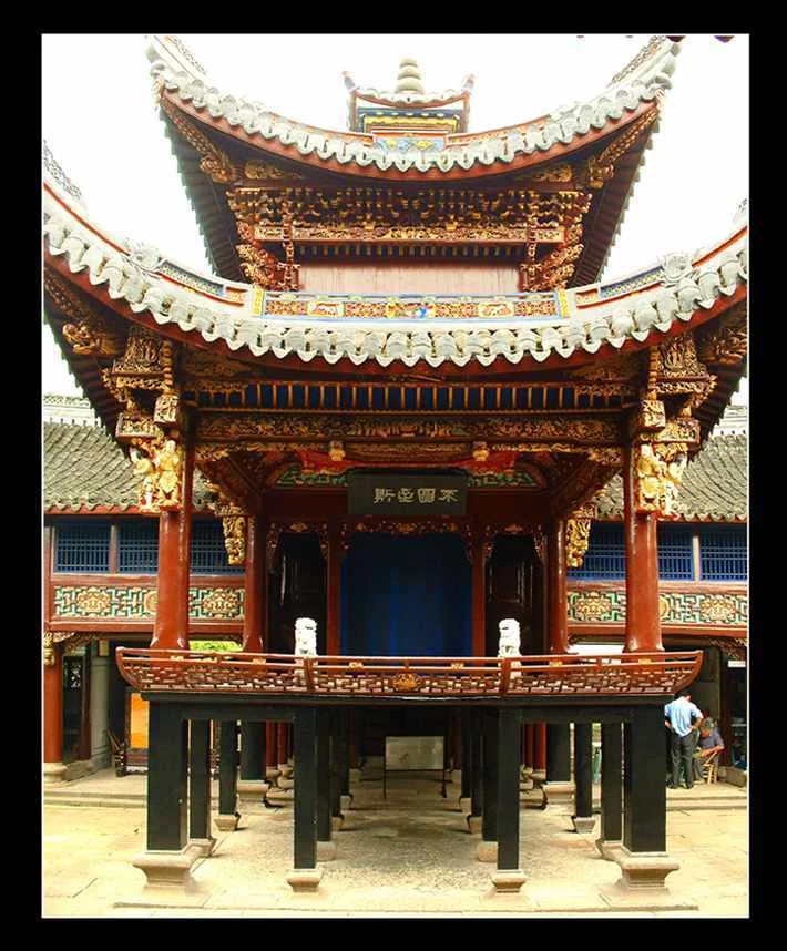 山门外的梁柱上,尽是形象生动的木刻浮雕,这些珍贵的艺术品,大小不过数寸,却神态逼真。进山门,重檐挑角的戏台映入眼帘,戏台长 5 米,宽 4.7米,高 12 米,戏台台顶呈鸡笼壮,尽用木板铺就,四根石制台柱挺立四角,中间又用一根横梁将上檐和盘托起。