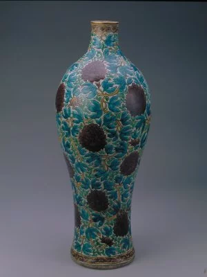 瓶口微撇,口缘镶铜,必溜肩,鼓腹,腹以下收敛,圈足。外壁白釉地素三彩装饰。近口沿处绘如意云头纹,腹部绘缠枝莲纹,近足处绘卷草纹。所施色彩有孔雀绿、黄、紫、草绿等。素底无釉。无款识。