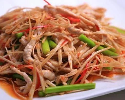 4、锅留底油,煸香葱姜,放入牛蒡丝炒,加入蒜苗、红椒丝,最后加上肉丝,一起拌炒,盐、帝态糖、酒调味即成牛蒡炒肉丝,另是一番风味。