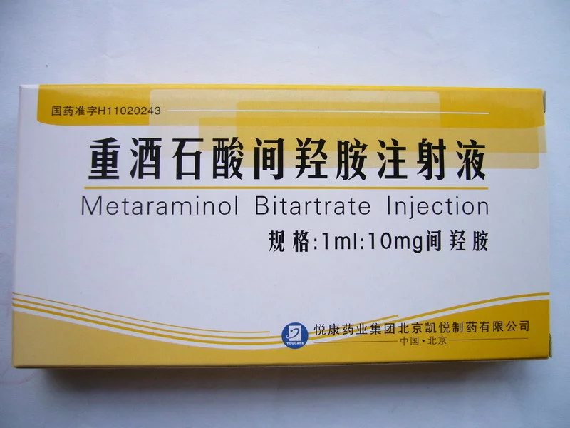 重酒石酸间羟胺注射液,适应症为①防治椎管内阻滞麻醉时发生的急性低血压;②由于出血、药物过敏、手术并发症及脑外伤或脑肿瘤合并休克而发生的低血压,本品可用于辅助性对症治疗;③也可用于心源性休克或败血症所致的低血压。