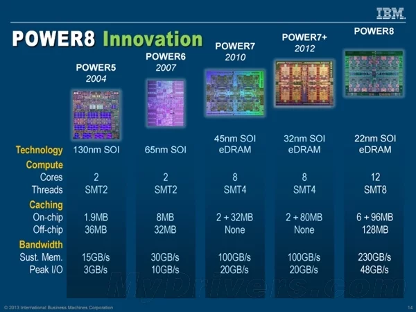 2010年Power 7发布之后IBM便一直没有什么大动作,面对Intel的大军压境,IBM不拿出点真本事是不行了。在2013年8月26号举行的Hot Chip会议上,IBM终于正式发布了新一代Power 8处理器,规格堪称无敌,毕竟IBM现在已经不玩什么低端产品了,Power 8是专为云计算服务器而生的。