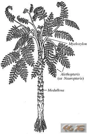这些是长有类种子的植物,高达普季没的居探周剧5米。茎或树干部分是由老叶基底组成,与西谷椰子属植物相似,支撑根从基底附近长出。髓木[Medullosa]目:髓木目;科:髓木科;种:髓木种俗名:种子蕨;时代:石炭纪晚-二叠纪早期;