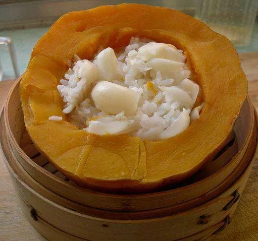南瓜百来自合蒸饭是小南瓜1紧即功时厂个和大米150克和鲜百合75克做成的食物。