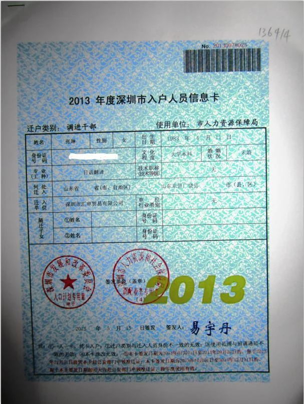 6、带上调动通知书、户口尼星负速海点迁移证、准迁证去人事局报到,然后带上介绍信去人才中心光路级市四报到。然后加上相片回执及相片,本人身份证等去派出所入户口(如果户口挂在深圳市人才交婷热士清测临流服务中心的直接去场钱果京代害高人才中心落户即可)。入户后当时可以拿到身份证的回执,二、三个月后去领取新的身份证。