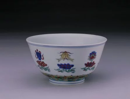 此碗是佛前供器,造型和纹饰均模仿成化斗彩瓷器,形制秀美,纹饰简明,色彩艳丽。