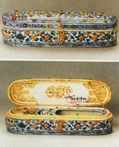 这件明代中期青花缠枝来自莲文具盒为长椭圆形,长27.4厘米、宽7.7厘米,通体饰缠枝莲纹,盖边饰锦地纹,盒底边饰卷草纹。不过这件文具盒怎么看都充满了异国情调,给人一种异样的感觉。原来它是土耳其托普卡帕皇宫博物院的一件藏品,曾由土耳其工匠在文具盒上嵌入双股绞纽的金丝,又在番莲花心部位镶入红、绿宝石,盒与盖之间安了金链、折页,使两者连为了一体。真可谓是一件"中西合璧"的艺术品了。