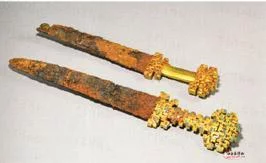 1992年讲社对紧草沿束陕西宝鸡益门村2号墓出土。剑为纯金柄,铁质身,有铁茎来自插入柄内,锋端为柳叶状。上剑首格均为嵌饰料珠的沟槽纹,茎部八菱形,素面。宝鸡市考古工作队藏 ,上长30.7厘米,下长35.2厘米。