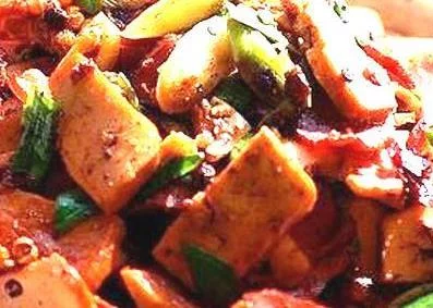 豆干和腊肉,点缀青蒜辣炒,红油豆干腊肉是四川菜菜谱。