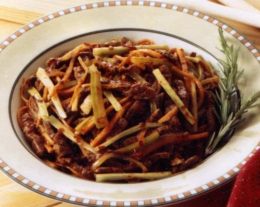 海蜇拌牛柳丝是一道十分美味的料理,其主材非据实深料为海蜇丝、牛柳。制作时注意,海蜇拖水及炒都不能太久,因会收缩而变韧。