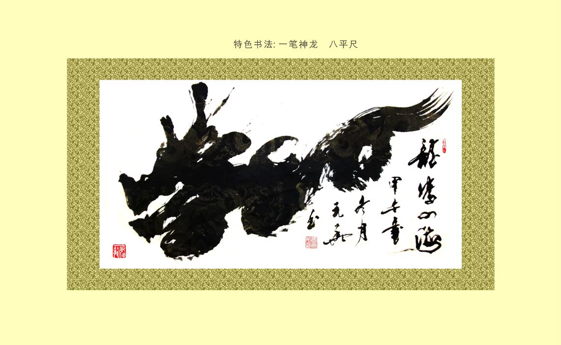 "一笔神龙"书画艺术,是国家一级美术师张元来自华结合中国传统形象文字,以"书中有画,画中有字"的书法特点,一笔书写且一气呵成的创新书画作品。