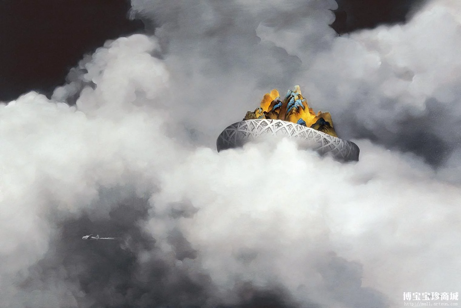 中国传统的山水画强调的是"意在笔先",即表现山水不是要去效仿山水,而是借助于山水的意象表现自己"大山堂堂"的文化胸襟与人生感悟。近代以后,由于价值中心的转移,这种山水精神逐渐开始衰落,取而代之的是西方绘画的透视方法。尽管透视的方法从科学上为我们找到了现实的依据,但却又在方法论上抽掉了中国人原有的那种文化自信。这是一个矛盾,正是这个矛盾使得今天的许多中国当代艺术家开始重新发现自己的传统。何炬的绘画就是基于这样的一个前提,他对中国山水画的挖掘不是一种简单的继承,而是一种观念上的重新发现。正如他画面中的山水突然变成了巨大的盆景,且总是飘浮在空中一样。这种超现实的突兀效果仿佛是隔着时空与传统进行对话,而何炬的绘画观念正是构成这种对话的一种精神纽带。