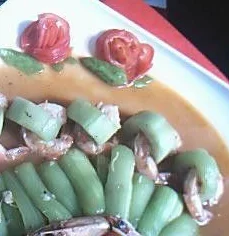 17.大米饭今天可是足足做了100克的!因为想到吃好菜,就会很下饭,当然要多做喽。足量的大米饭,酥糯的丝瓜,清香的虾仁,嘿!丝瓜的甜和虾仁的甜互不相扰,好有趣呢。哦!还有那美味的汤汁不可不提嚛:友们看出来偶装盘的缺点了么?汤汁太多,把漂亮的小西红柿花都给"淹死了"。但是那汤汁太美味了,俺把它全部浇在米饭里啦。