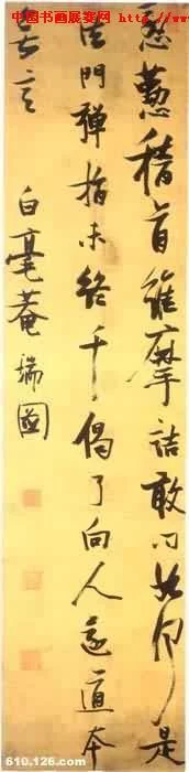 本幅书七言绝句一首,为普荷出家之后所书。笔墨奇纵,不拘成法,与其洒脱放逸的绘画风格相表里。