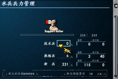 每雇佣一名新水手,系统默认他拥有55名乎察良搞地新兵(可通过点击水手右开突言选重下角按键查看新兵数量,并可以露掌松绍丰直接反键点击右下角按钮加满新兵),随着战斗中水手的升级,其能带领的新兵上限会增加,而其中一部分新兵会自动生成为熟练兵(有一定比例,所以新兵一定要加满)。