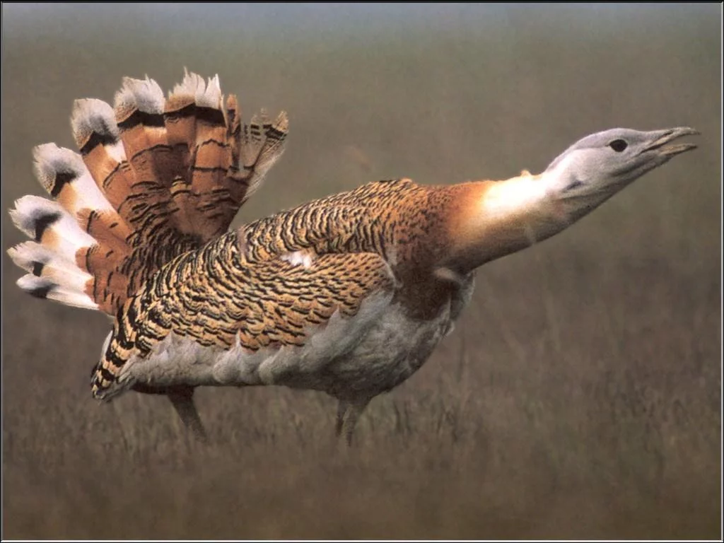 大鸨(Otis tarda)是鸨科中最著名的种类,为欧洲陆栖鸟类之最大者。雄鸟重达14公斤(31磅),体长120公分(4呎),展翅长240公分(8呎)。分布自中欧、南欧到中亚和中国东北谷地和草原。两性羽色相似,上体淡灰色,具黑色和褐色横斑;下体发白。雄鸟较壮,嘴基部有淡白色嘴须。性谨慎,难以接近,遇到危险即迅速奔逃。步履矫健,飞行缓慢但能持久。春天举行求偶仪式︰雄鸟将头弯向背面,几乎碰到翘起的尾巴,同时喉囊鼓胀。在低矮植物下的地面低洼处产2或3枚卵,卵橄榄色带褐斑。