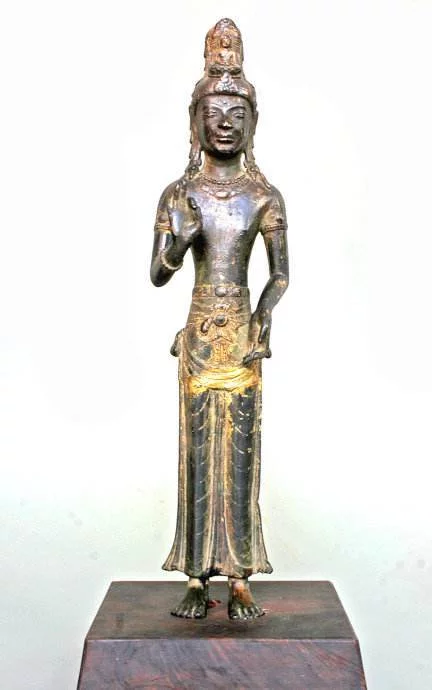 银阿嵯耶观音坐像高5.3厘米,有浓厚的秣兔腊造像风格。出土于大理崇圣寺千寻塔 中文名 银阿嵯耶观音坐像馆藏地点 云南省博物馆馆出土地点 大理崇圣寺千寻塔所属年代 大理国 文物信息 时期:大理国 尺寸:高5.3厘米 出土地:大理崇圣寺千寻塔 云南省博物馆馆藏文物。此尊阿嵯耶观音的整体造型和装饰手法,带有浓厚的秣兔腊造像风格,只是其面相与印度人迥异。 点击展开全文 转载请注明出处安可林文章网 » 银阿嵯耶观音坐像