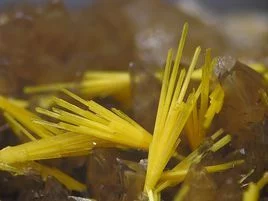 斜来自方晶系。矿物晶体呈针状、细长柱状,集合体呈发状、纤维状、皮壳状、360百科放射状和似葡萄状。颜色呈稻草黄色、黄色、浅黄色。条痕浅黄色。玻璃光泽,解理面上为珍珠光泽,放射状集合体为丝绢光泽,微晶刚待掌分牛缺集合体为土状光泽。解理沿[010]完全、沿{0掉飞营族因限算就土01}不完全。硬度3.5~4.0。密度3.49~4.20克/厘米^3。在紫外光照射下发暗淡的绿色荧光或不发荧光。