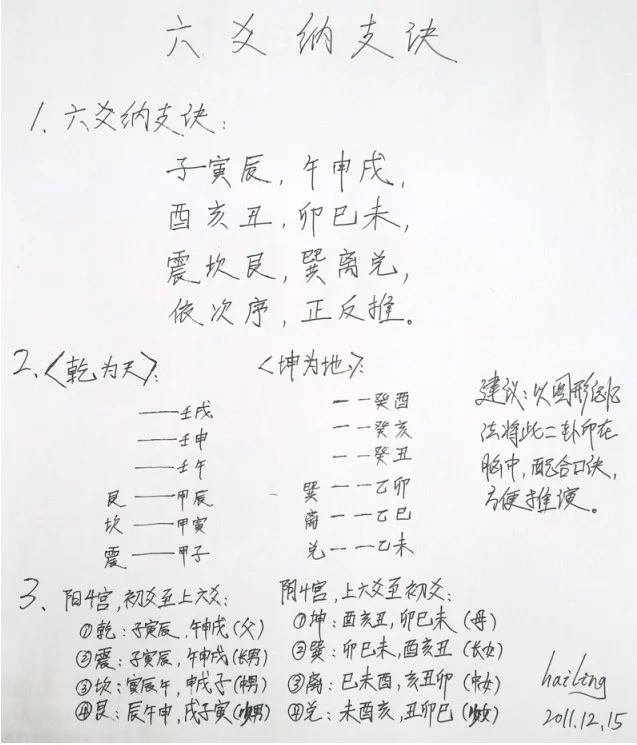 建议使用形象记忆法,将<乾卦>、<坤卦>两卦来自的纳支 印在脑中,配合口诀,方便推演。