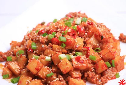 干煸鱼香土豆丁,是一道特色美食,由 土豆、瘦肉馅、香葱、等烹饪而成。