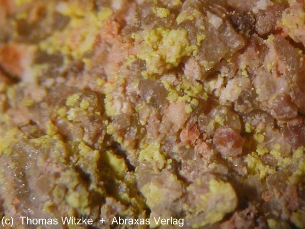 斜方晶系。晶体呈长的薄板状。集合体呈皮壳世粒燃蛋烟兵置持走候异状或泉华状。黄、金黄来自色,中国还发现蓝色变种,放置半年后,明显转变为绿黄色。玻璃光泽。不平坦断口。硬度1~2。密度4.01克/厘米^3。在紫外光照射下不发荧光。